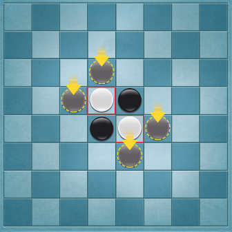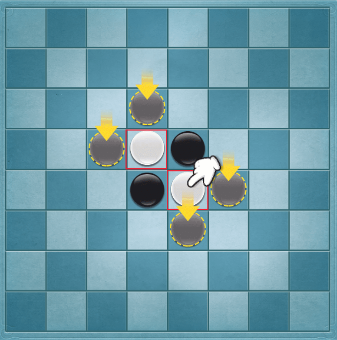 2、只能在箭头指示的格子处下棋,每回合下一子,当自己放下的棋子在横、竖、斜八个方向内有一个自己的棋子,则被夹在中间的对方棋子全部翻转会成为自己的棋子。