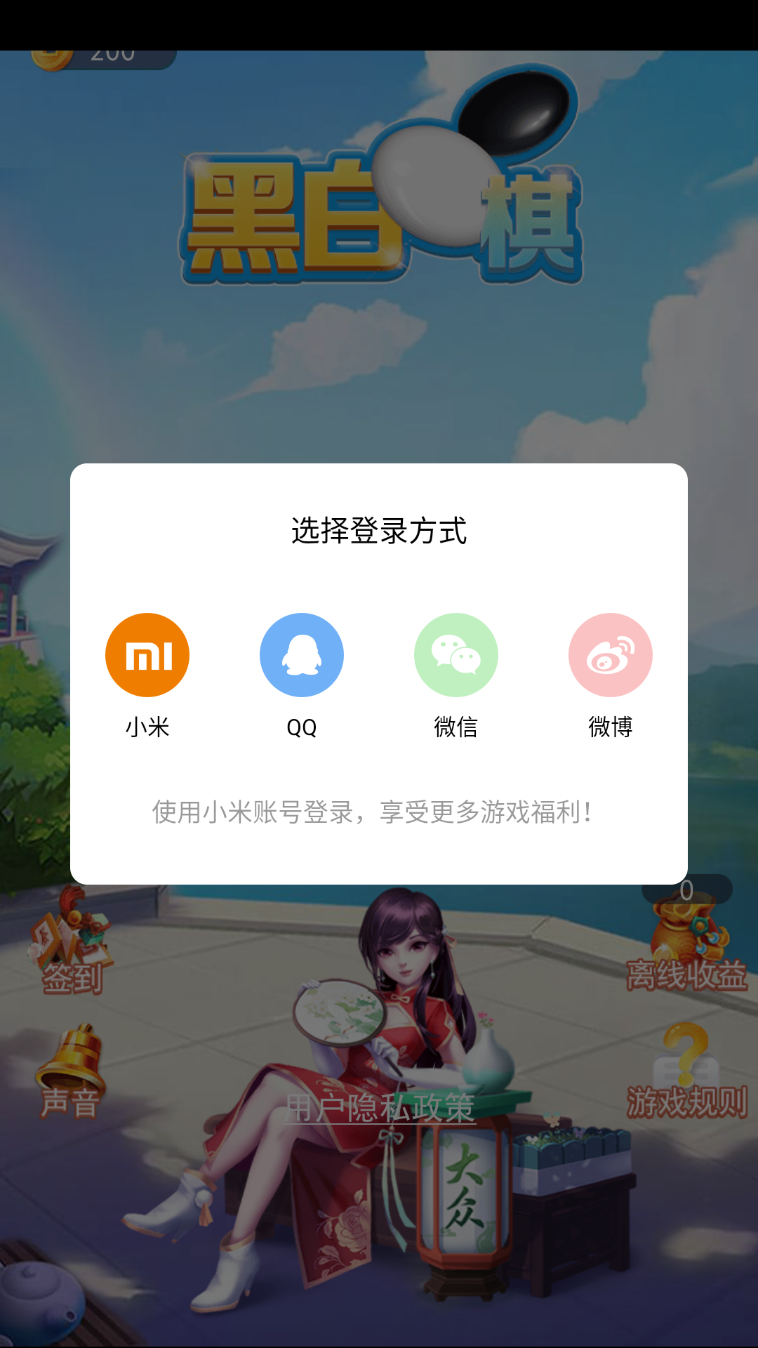 该版本中玩家需要使用小米账号或其他方式登录才可继续游玩。