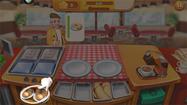 2、可以看到客人需要煎蛋与面包的组合,需要按照顺序进行制作并在规定时间内送出。