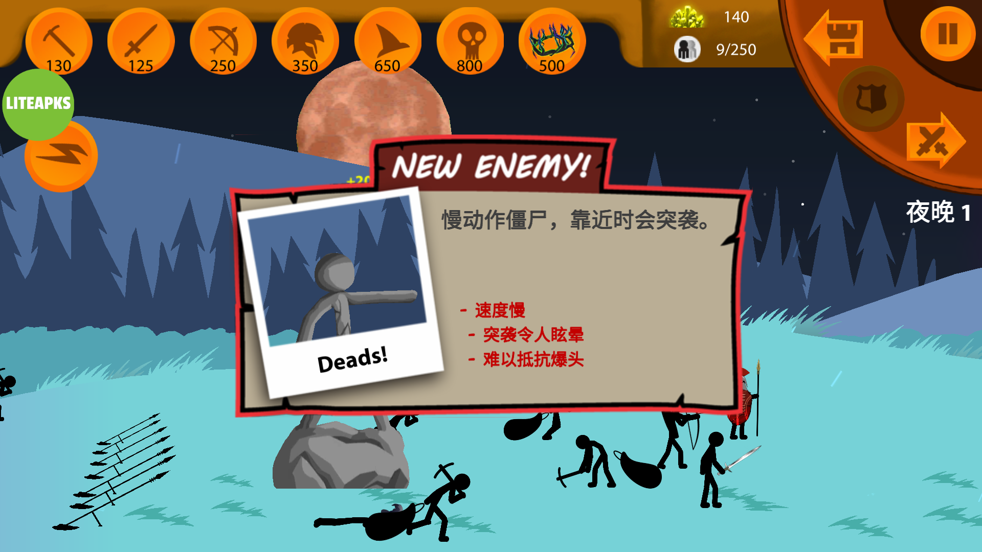 1、经典的策略塔防模式,通过挖金矿来获取资源制造出更多的火柴人发起进攻。