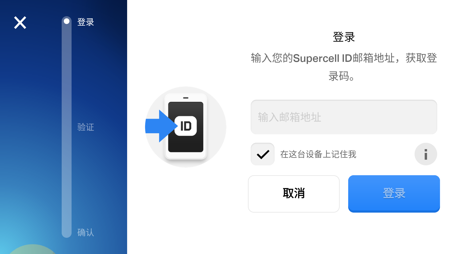 4、将你的Supercell ID输入后,获取一个验证码即可完成账号登录。