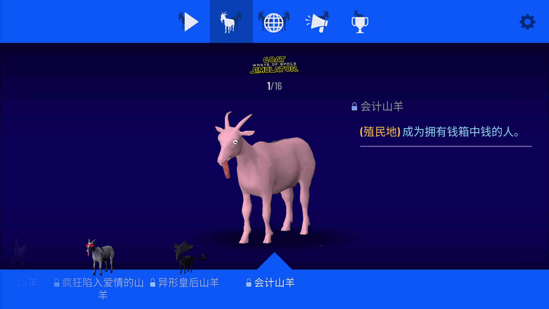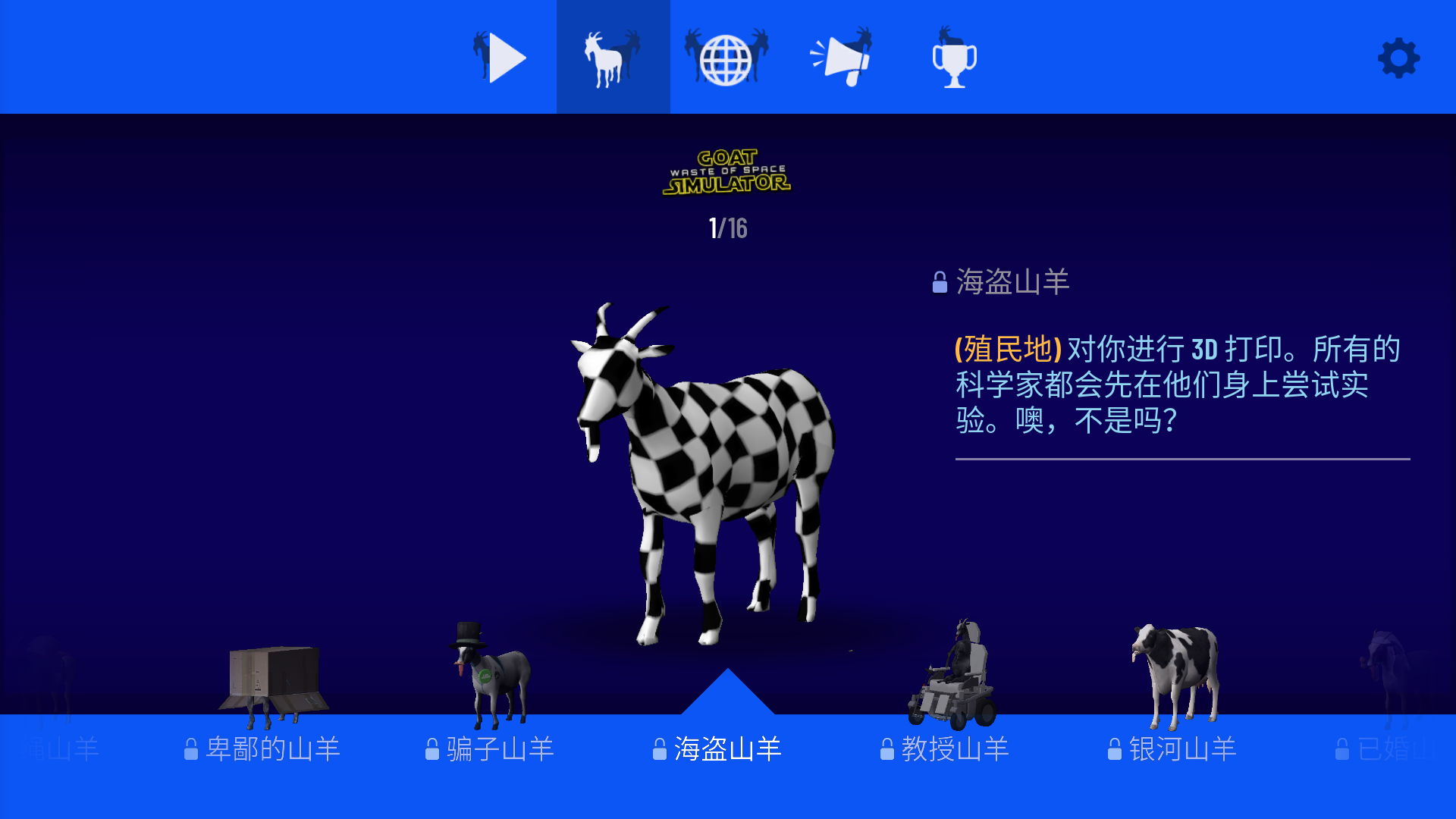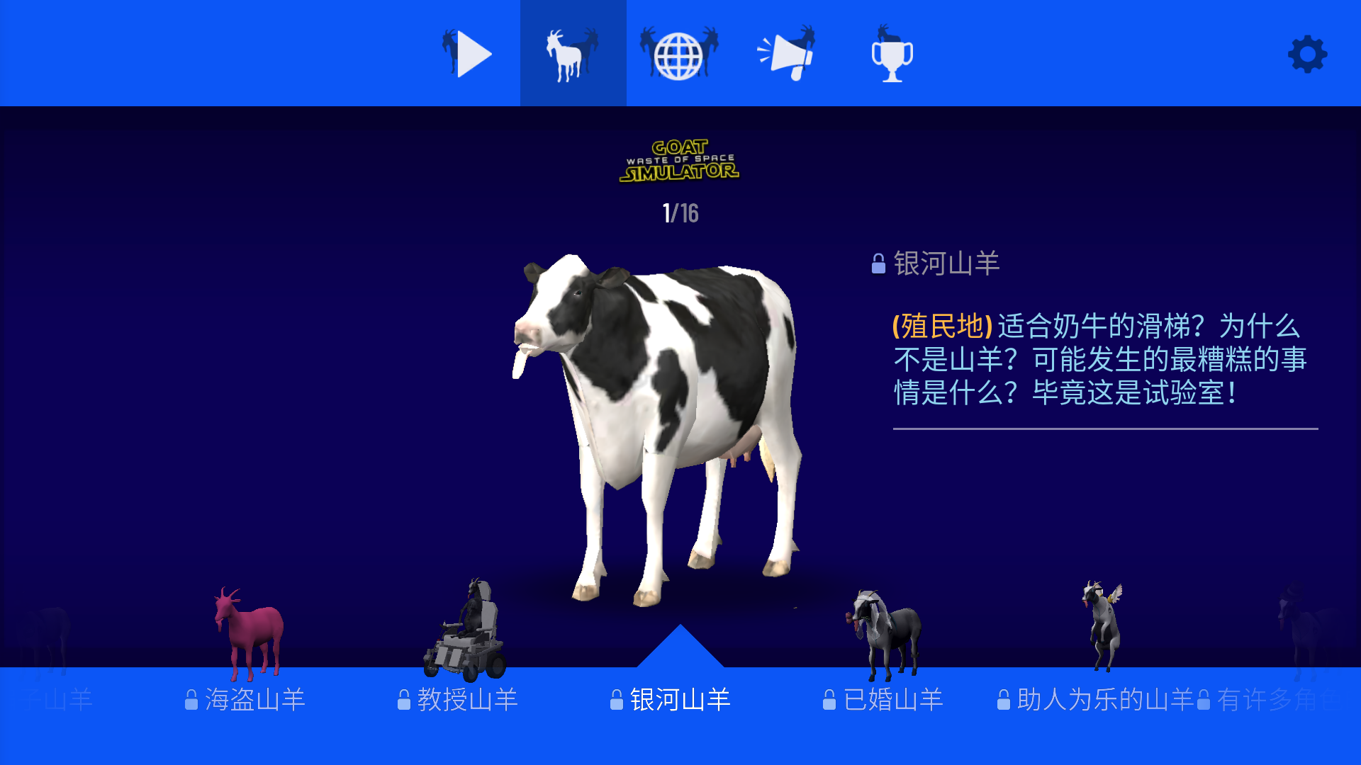 模拟山羊太空废物全称为WasteOfSpace,作为模拟山羊系列的外传版本,本次的世界观从地铁直接移动到了外太空的世界,而玩家扮演的山羊将继续在人类的世界中随意破坏,就算这里是外太空。全新的小羊种类需要完成不同的成就来进行解锁,形态各异的小羊将会提供完全不同的技能使用,跟随主线任务的剧情进行快速的冒险获取金币等奖励,非常魔性的武器与技能等你来解锁使用,完整版本的游戏内容能够自由的探索太空城市的每一个角落,获取更多的资源让小羊彻底疯癫。