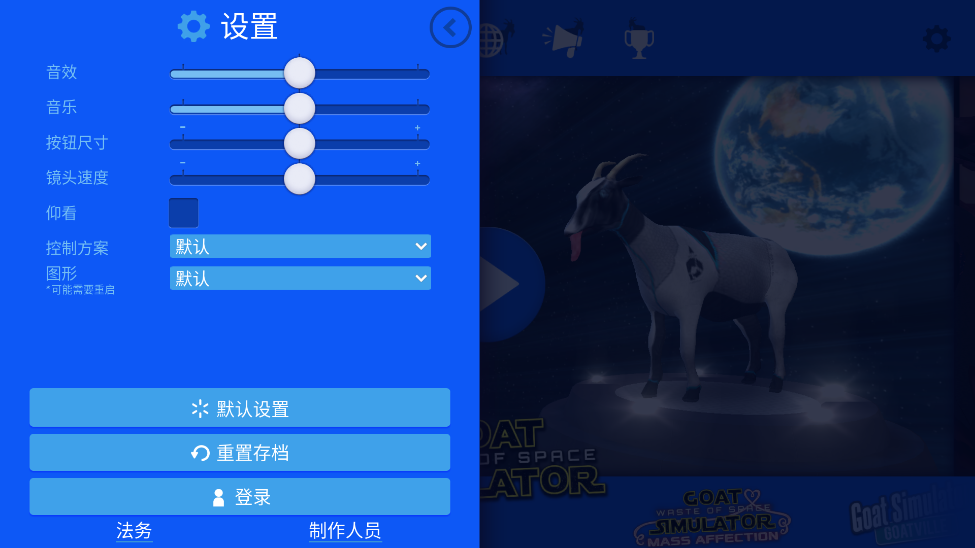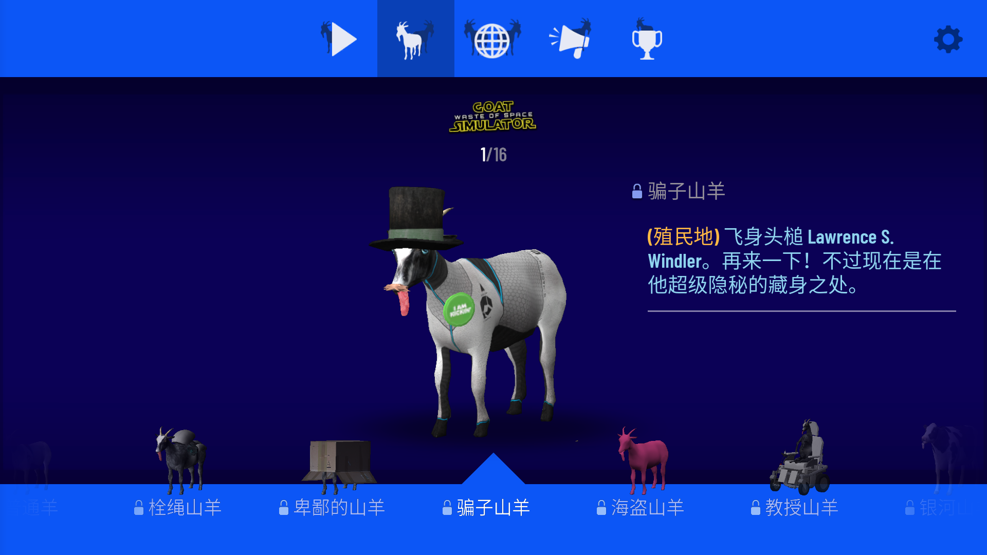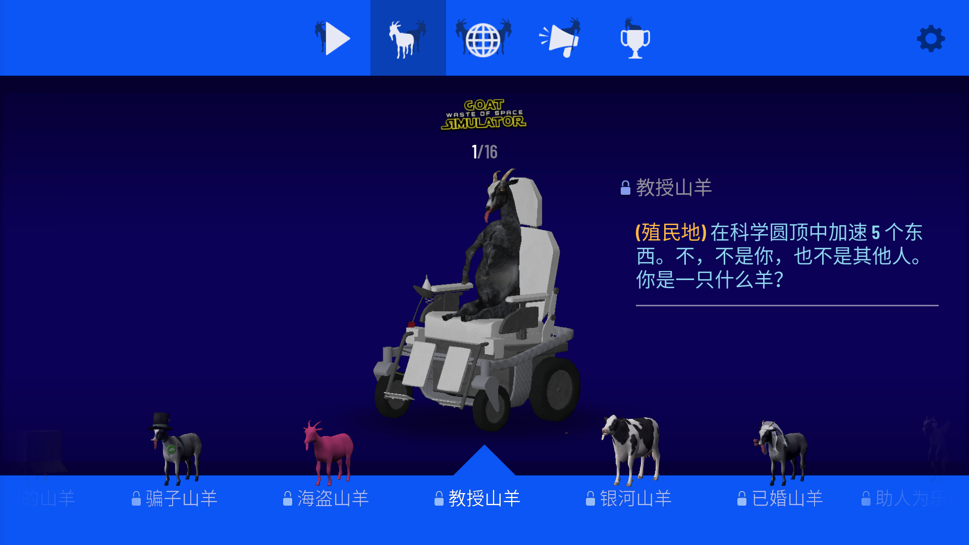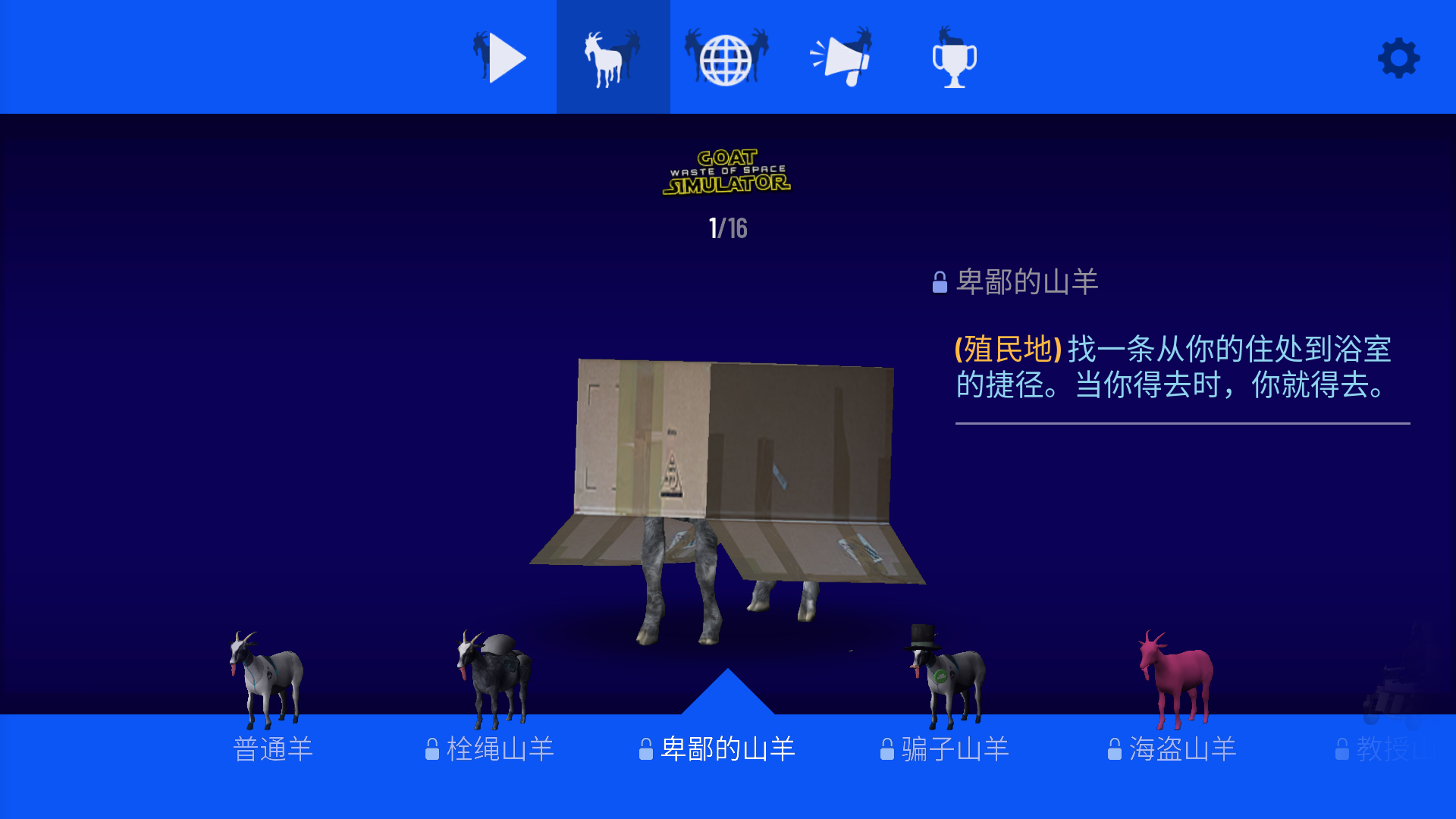 模拟山羊太空废物全称为WasteOfSpace,作为模拟山羊系列的外传版本,本次的世界观从地铁直接移动到了外太空的世界,而玩家扮演的山羊将继续在人类的世界中随意破坏,就算这里是外太空。全新的小羊种类需要完成不同的成就来进行解锁,形态各异的小羊将会提供完全不同的技能使用,跟随主线任务的剧情进行快速的冒险获取金币等奖励,非常魔性的武器与技能等你来解锁使用,完整版本的游戏内容能够自由的探索太空城市的每一个角落,获取更多的资源让小羊彻底疯癫。