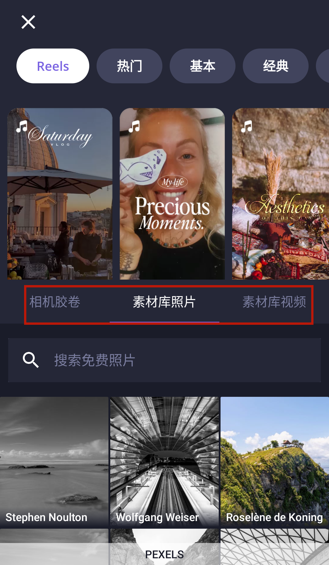 2、随后用户能够自由的挑选你的模板与想要使用的照片,没有足够的照片也能够通过素材库进行寻找。