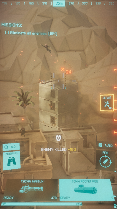 2、在关卡内需要使用自动射击来消灭所有敌人,注意当前直升机的血量。