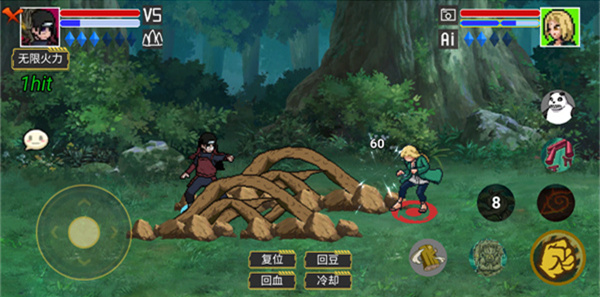 在游戏战斗场面中,这款游戏也是采用了横版限制性的游戏地图,玩家选择一个忍者来与人机进行对抗格斗。同时,在游戏战斗中,可以说忍术技能和特效都是拉满的,比如傀儡蝎的大招父母傀儡,真就在这款游戏中还原并且呈现了出来。