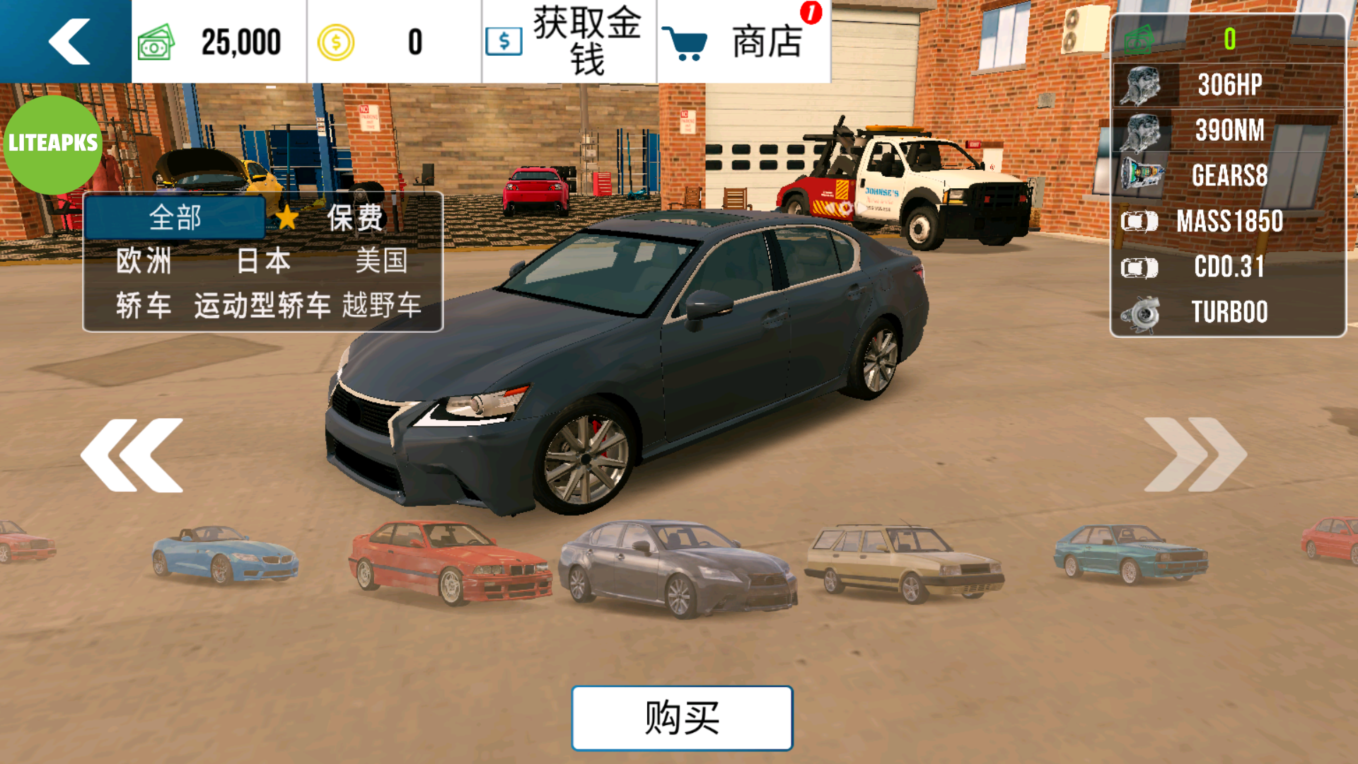 2、当你挑选好车辆后即可在修理厂中开启自由的改装模式。