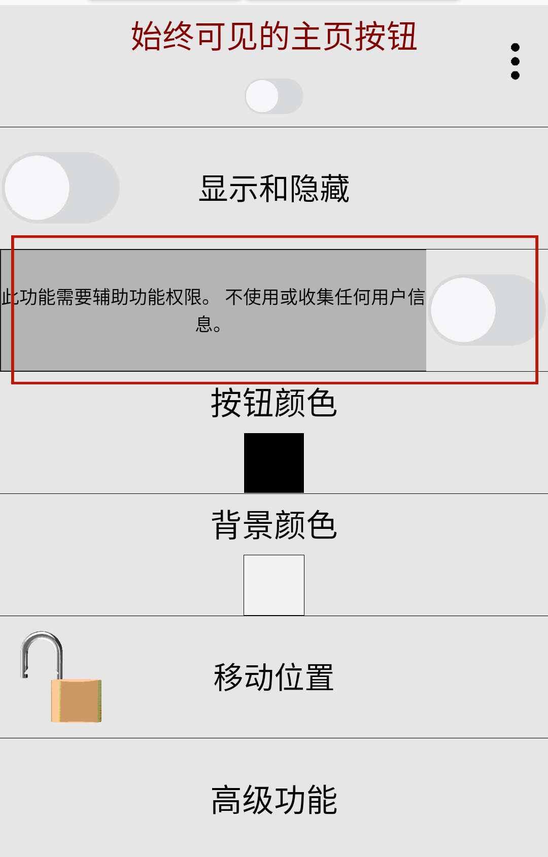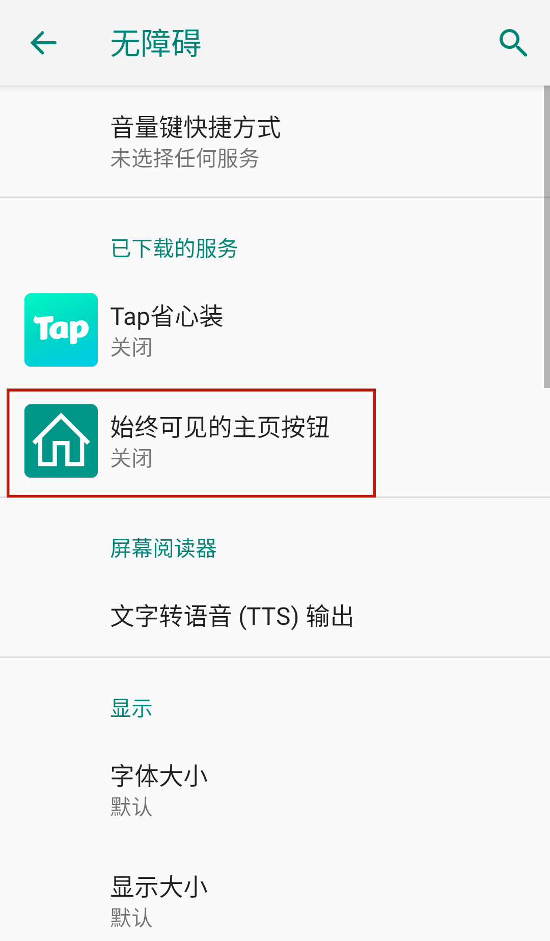 2、进入到手机辅助页面中后,找到始终可见主页按钮,点击进入。