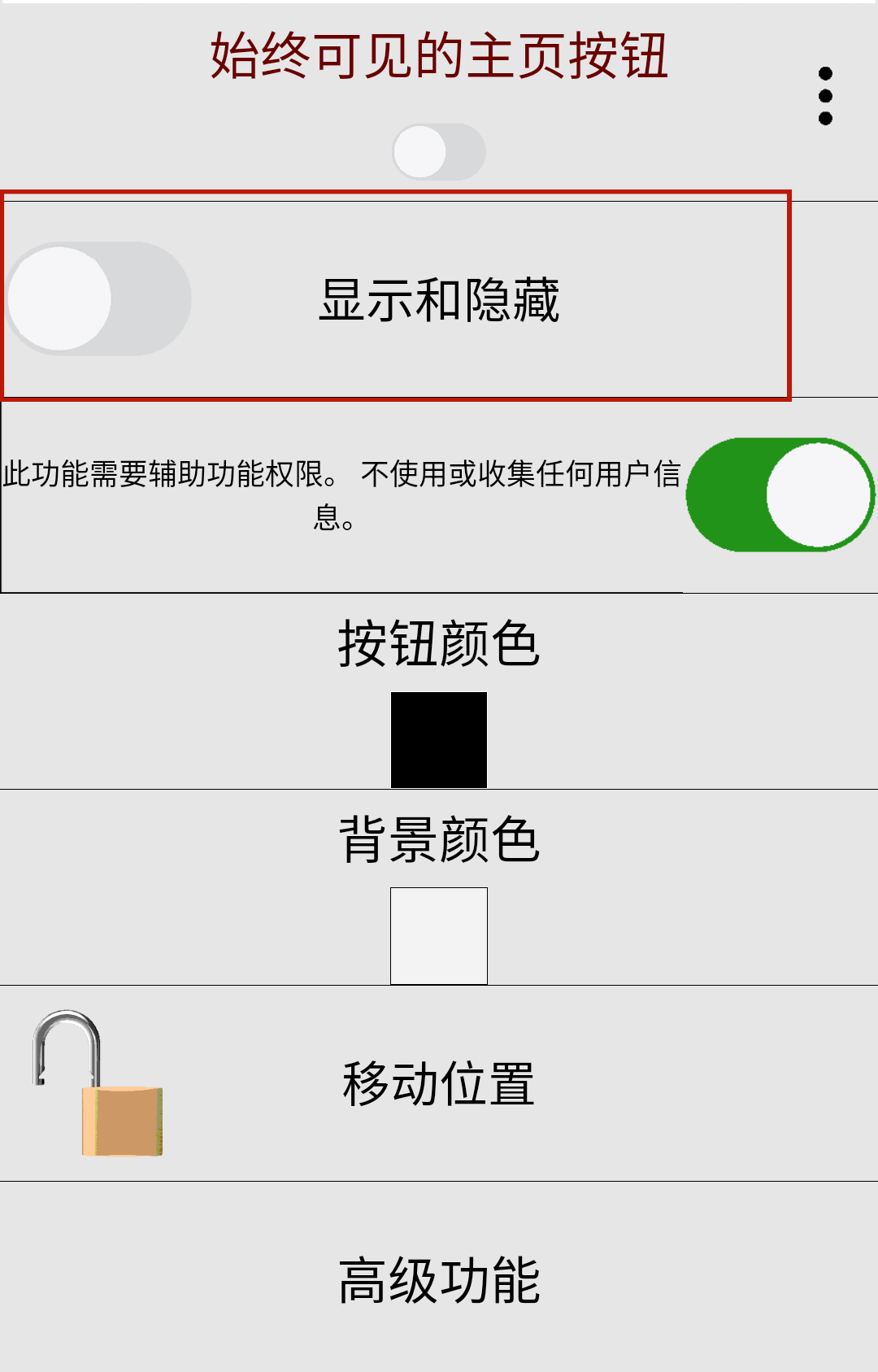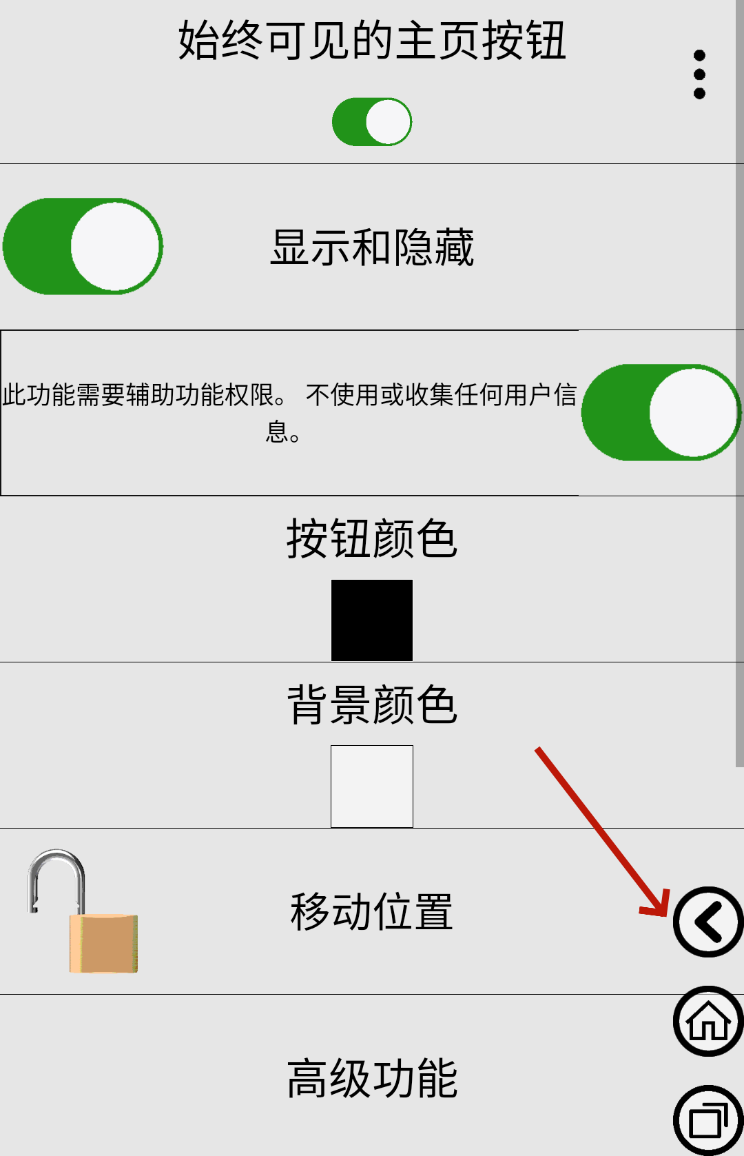 始终可见主页按钮全称为Always visible Home button,将用户日常对于手机的返回主页面制作成为了一个实用工具,借此来替代手势滑动的相关手机功能,所有的用户都能够摆脱手势经常出现错误的困扰,享受最原始但是非常实用的主页返回用法。软件内置了关于返回主页按钮的多种不同的参数可以调整,从颜色、大小、位置等不同方面来用户进行DIY自定义化,还有经典的后退与撤回按钮也可以进行设置,让用户能够不同的手机场合下都能够达成一键返回至主页面,保护你的秘密!