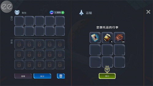 2、在基地中可以自由的选择物资放入背包开启星际旅行。