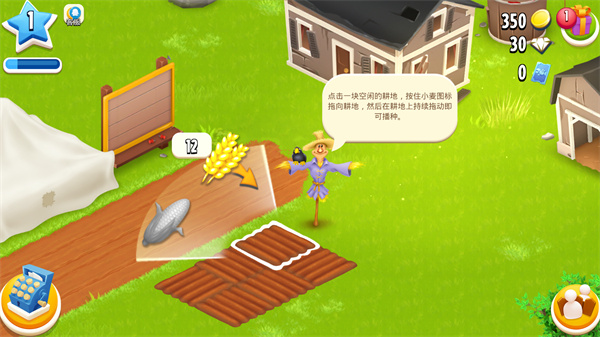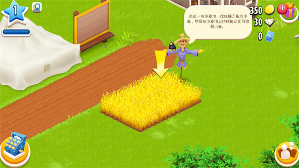 1、进入游戏后将会从0开始教导玩家经营你的农场,首先是简单的割小麦功能。