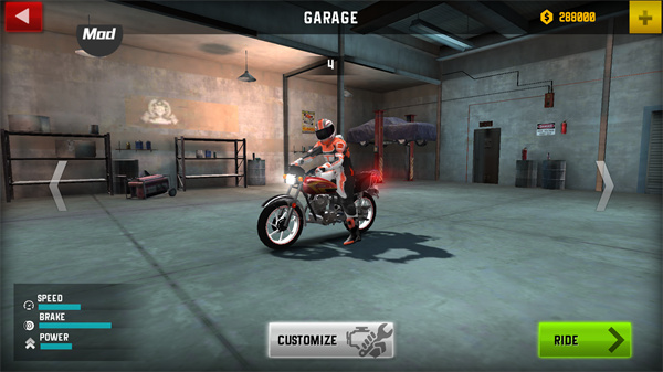 2、超多不同类型的摩托等待玩家进行驾驶骑行,使用金币来解锁更高等级摩托驾驶。