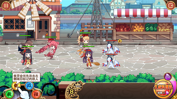 5、在战斗界面中采取了自动战斗玩法,合理的使用角色的属性来生成不同的料理技能使用。