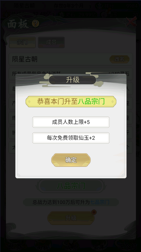 2、当宗门的战斗能力累计到了一个值以后即可进行免费的升级。