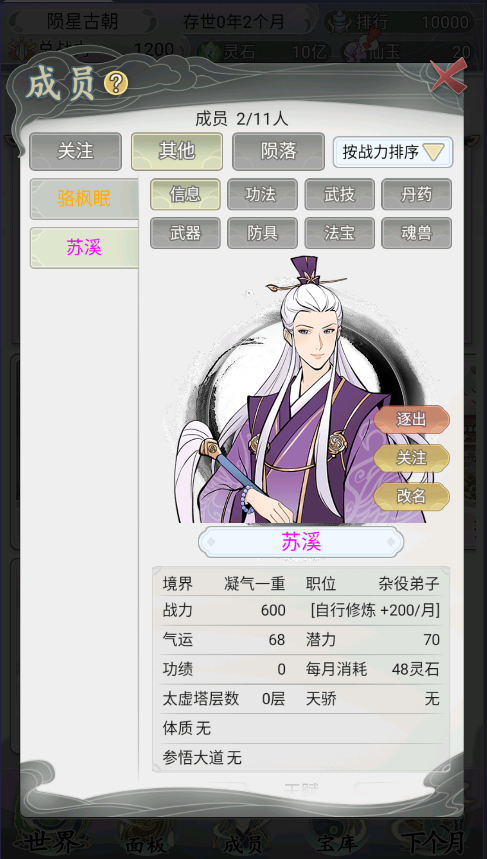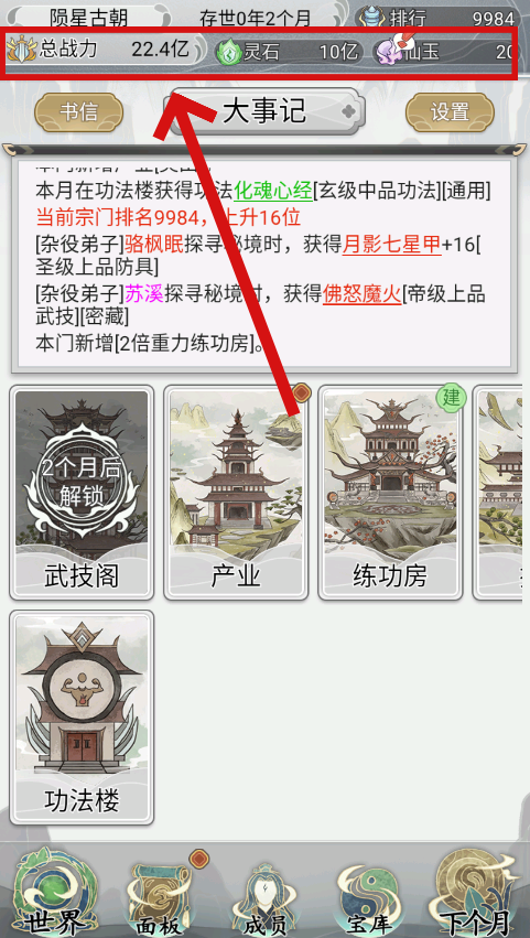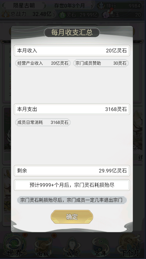 3、每一个月的宗门支出与汇总都会如实上报,玩家可以仔细的观察宗门内部情况。