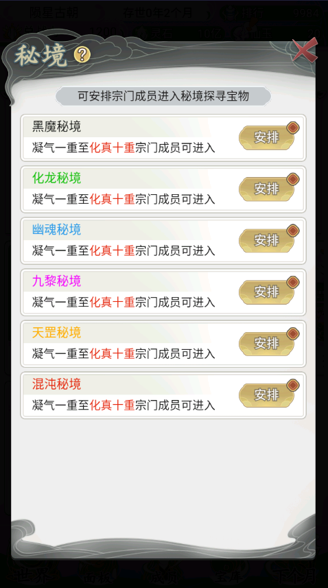 3、功法与修炼资源需要从秘境中不断的获取,增加门派的底蕴来吸引更多的弟子。