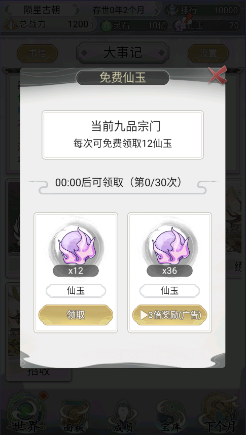 1、游戏内的仙玉非常重要,并且跟随着宗门等级的提升而不断增加可领取数量。
