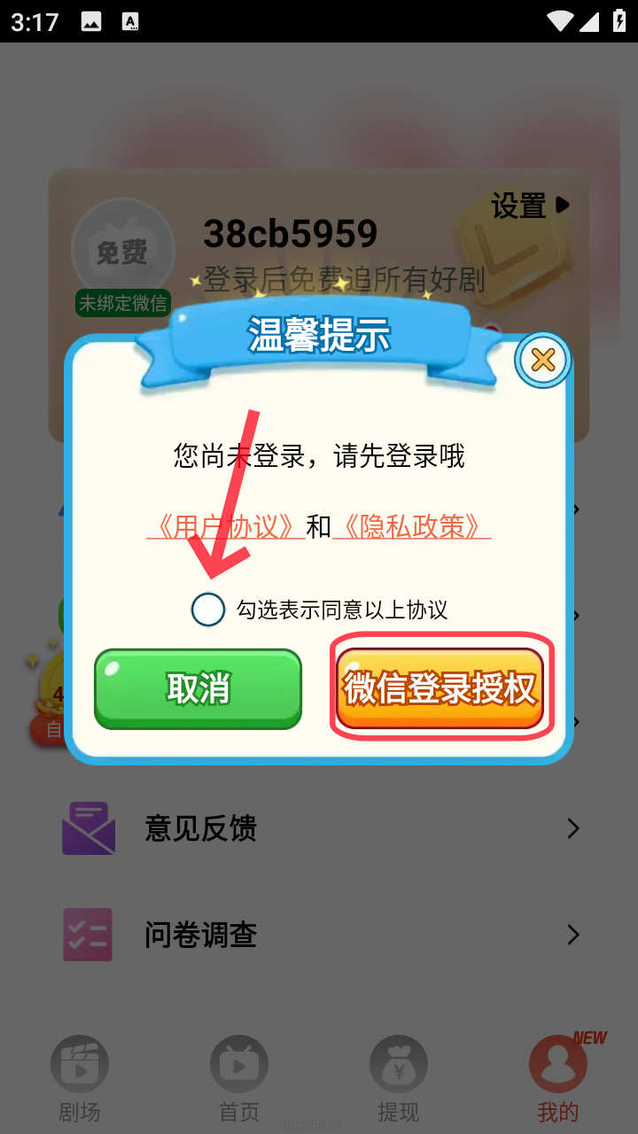 3、勾选弹窗中的协议,然后使用微信进行登录,只有微信登录这一种方式。
