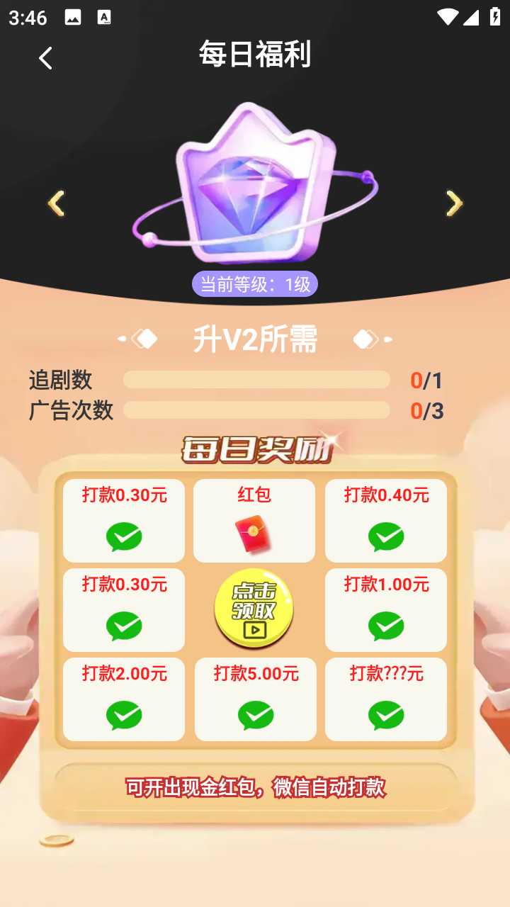 用户可以通过追剧的数量来进行福利等级升级,然后可以进行抽奖来获得各种收益,往后的收益是越累越多的。