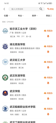 1、大学查询功能,可以通过搜索的方式来获取到想要的学校信息,并且还有招生办可以在线进行咨询。