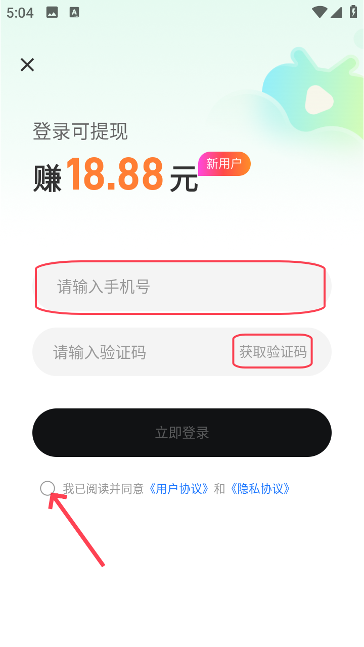 3、勾选用户隐私协议之后,输入手机号码,获取验证码之后就能登录了