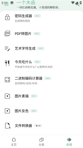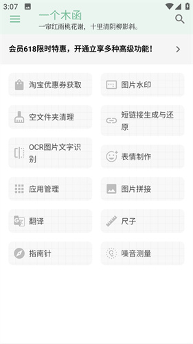 一个木函是一款集成了大量的实用工具的百宝箱app,将用户日常生活中所需要使用的工具全部放置到了一个小小的软件内,并且可以通过搜索的方式直接获取到所需要的工具内容,别看功能非常多但是其软件的体积小巧且界面十分清新。大量的工具以在线的形式进行展现,用户需要使用一定的流量加载后才能够使用,无需任何的下载服务即可取得便捷的使用权利,帮助每一个用户缓解寻找工具的燃眉之急,并且没有任何的广告植入整体使用起来感觉十分的清爽。