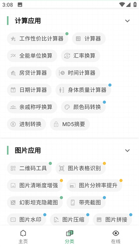 1、软件通过分类的方式将不同的功能进行了细致的划分,用户可以根据类别进行查找。