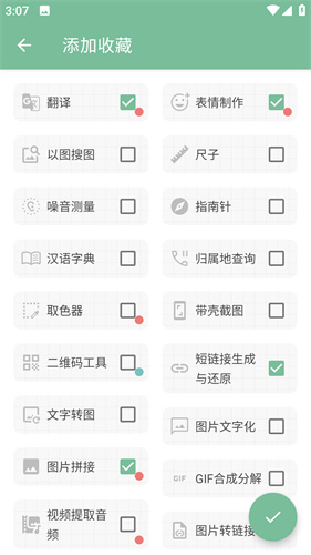 2、点击+号后即可看到各种不同的实用工具,在后面打勾即可完成收藏。