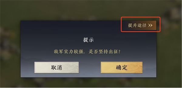3、攻占地块时,记得查看地块信息及守军实力,可以前置思考应对策略防止翻车损耗,如果系统提示敌军实力较强,是否坚持出征,一定要三思后行。可以跟随提升途径指引,考虑提升武将、战法等级,也可以建造军营(内城君王殿6级后)提升武将带兵数量。