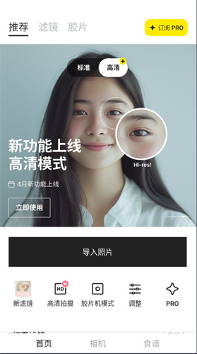 新推出可以用分辨率进行拍摄的高清模式,前后置均适用。
