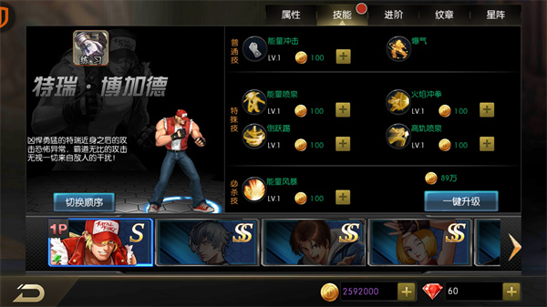 1、游戏内的角色所有技能都可以进行主动升级,利用金币点击一键升级即可。