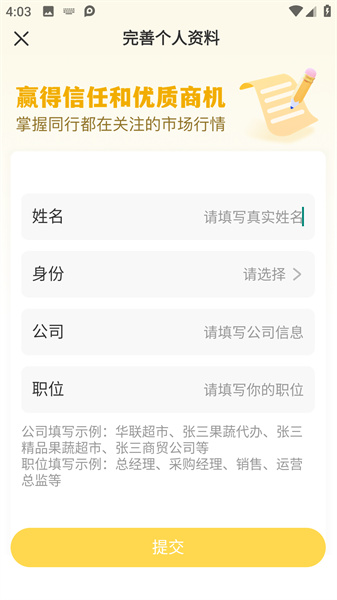 1、用户需要先完善你的资料,来证明是一位拥有资格的农产品采购人。