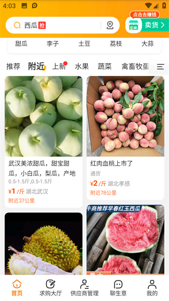 2、点击附近按钮将会实时的推送最新且最近的农场品信息,并附带具体的价格。