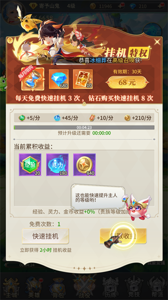 2、进来之后,可以选择快速挂机,每天都有免费一次的机会,也可以直接点击领取收益。