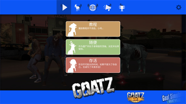 模拟山羊僵尸版也叫模拟僵尸山羊,作为模拟山羊系列的特殊改版之一,在原版的基础上融入了大量的僵尸模型并且将山羊也进行了僵尸化,此时玩家所需要做的不止是无止境的进行破坏,还要肩负起来一定的消灭僵尸任务。游戏依旧是没有任何限制的探索玩法,选择你的山羊样式后即可开启轻松的冒险之旅,大量的技能可以进行解锁使用让山羊的破坏力能够持续增加,非常成熟的生存模式来帮助玩家享受轻松破坏带来的乐趣,各种僵尸化的山羊非常呆萌带来全新的游戏体验!