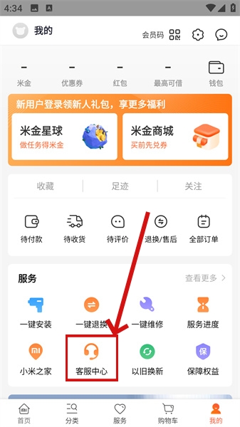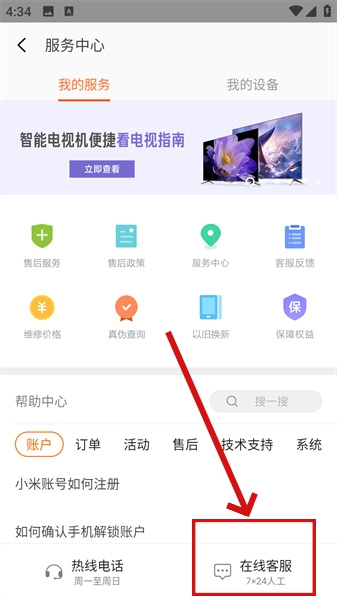 2、随后点击“客服中心”,进入到具体的客服查询页面内。