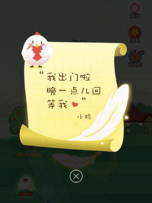 2、小鸡出门期间庄园首页留有小鸡留下的羽毛信,小 鸡出门去做一件神秘而有意义的事;