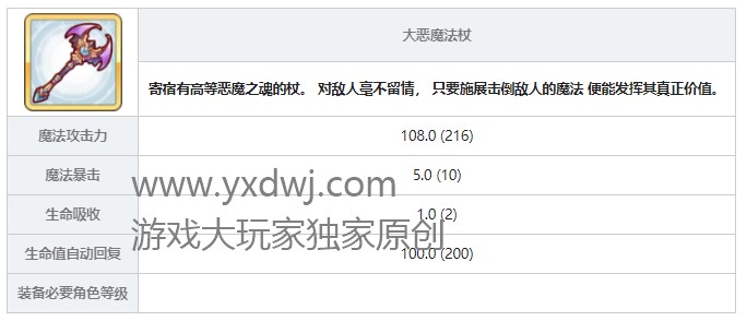 大恶魔法杖是一款法系职业在升级的时候需要的一款法杖类型的武器,可以在里面大量的增加暴击还有吸血属性。