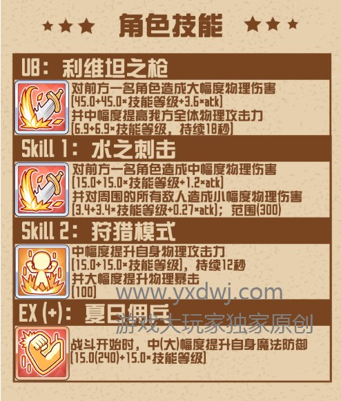 我们可以看到这个角色主要的技能是物理伤害加上范围打击,是一个比较基本的中排物理输出手。