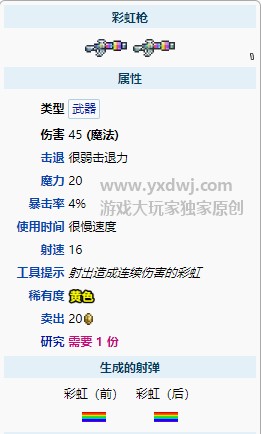 彩虹枪是一款肉山后可以持续输出的法师武器,玩家可以作为一款持续输出的辅助工具使用。
