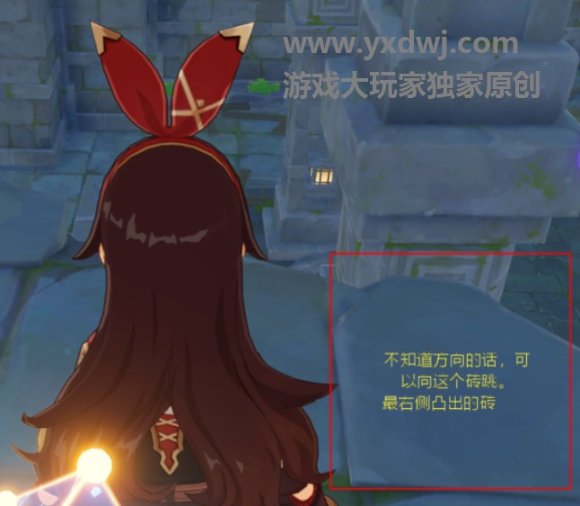 不知道方向的话,可以向这个砖跳,最右侧凸出的砖。
