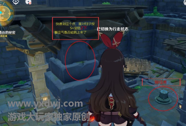 然后快速到中间这个点,面对柱子按S+空格2下看运气是否能跳上来了。