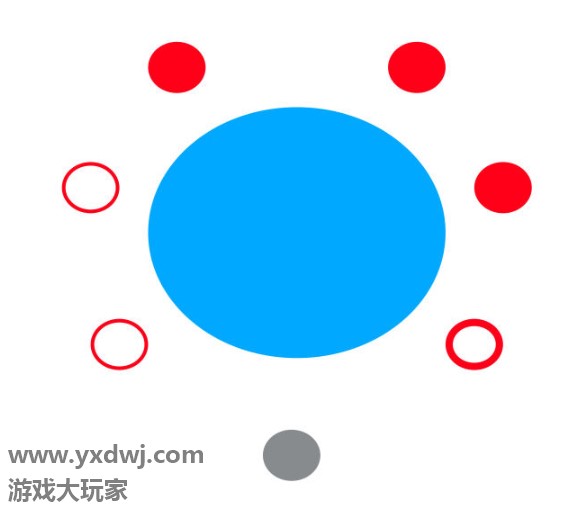 灰色的圆点代表着玩家的位置,六个圆圈代表着火炬。