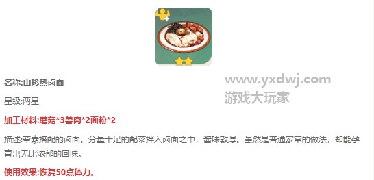 山珍热卤面是一款能够恢复玩家的50点体力的菜肴。