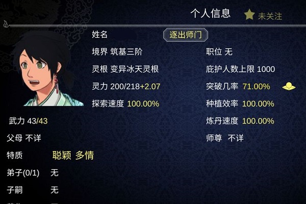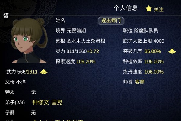 前期注意把弟子安排到岗位上工作,不要收太多弟子,走精英路线,其实到后期你都可以单挑大多数副本,战力在100~200万,可以的话也可以选择去百宝阁低买高卖。