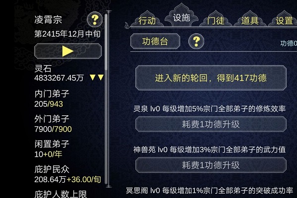 庇护民众的功德+修复天梯的功能,可以让二周目体验一把开挂的人生。掌门一直能突破,也不着急轮回。