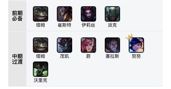 大树、蔚、塔姆、人马、腕豪、狼人、李青、努努、塞拉斯