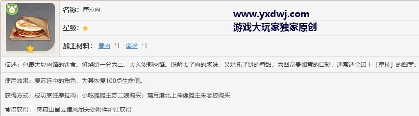 通过判断其实我们可以看出来是只有摩拉肉这一款食物的制作材料是只有肉和面粉的。