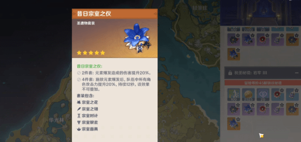 最后一个华池岩岫也就是物理本,这个本是最不推荐大家去刷的,现在的唯一物理输出角色雷泽,他的毕业套是4角斗套,根本就用不到这套圣遗物,所以没有必要特地刷一套这个圣遗物,刷这个纯粹是在浪费树脂,这个本的另一套圣遗物宗室套,给辅助用还是可以的,在40级的时候可以刷两把,不用多刷,可以学我这样弄个4件套马上收手。这个圣遗物基本是给安珀,凯亚这种完全的工具人使用的,甚至词条都可以不用考虑,只需要凑够四件套属性即可。