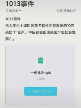 最近很多大学都会一份特殊的礼物“攻击”了,据说这是一个比较恶意的软件,只要完成了下载就会发出o泡果奶的声音,而且声音会不断的增大,怎么都关不了,魔性的o泡果奶广告声会让你崩溃掉,那么送o泡果奶是什么意思呢?其实也没什么意思,就是想恶搞一下,广大的用户朋友最好不要下载这个软件,不点击、不传播才是有效的应对方法!